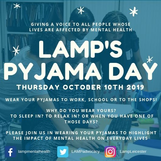 If you are a school, workplace, community group, or just yourself at home in your pjs, looking to show your support for a worldwide mental health awareness day, please join us in wearing your pyjamas on Thursday 10th October 2019! If you are looking to fundraise in support of Lamp on World Mental Health Day, whilst holding your pj day you could ask for a suggested donation of, for example, £2 for every person who participates, which would be a fantastic act of kindness that we would very much appreciate.
